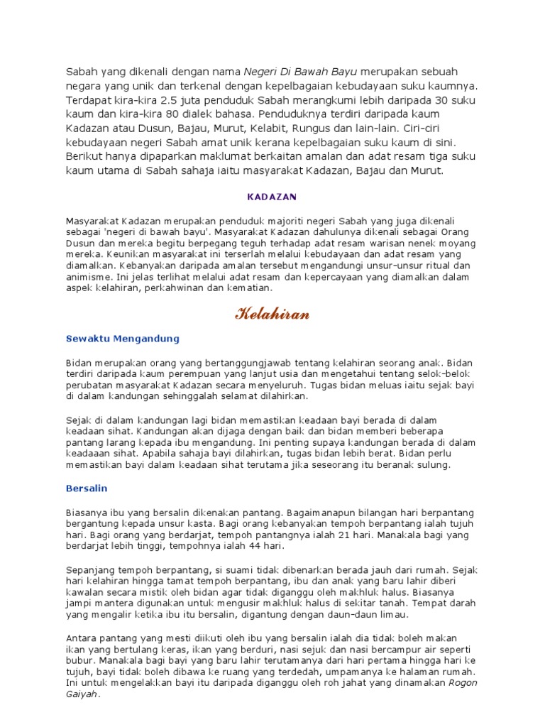 Manakala masyarakat kadazan yang tinggal berjauhan masih boleh melakukan sebarang pekerjaan. Pengalaman kadazan dataran penampang sabah hanafi hussin abstract. Warisan dan peninggalan nenek moyang mereka ini ada yang masih lagi sesuai dan ada yang sudah tidak relevan dengan zaman moden ini. Download adat dan pantang larang orang cina, kadazan, iban. Pantang larang sewaktu mengandung bukan sahaja dikenakan kepada wanita yang sedang mengandung malah si suami turut dikenakan pantang larang. B) sehari sebelum majlis perkahwinan diadakan bakal pengantin tidak dibenarkan keluar daripada rumah. Perayaan bangsa cina a perayaan ching ming hari ching ming merupakan hari bagi masyarakat cina berziarah ke makam orang tua dan leluhur membersihkan makam dan juga melakukan ritual. We are a sharing community. So please help us by uploading 1 new document or like us to download Pantang larang sewaktu mengandung bukan sahaja. Pantang larang atau tabu (bahasa inggeris: Mereka juga sangat bergantung kepada nasib dan tak hairanlah jika tukang tilik memainkan peranan yang penting dalam hidup mereka. pantang larang itu hanya dikenakan kepada mereka.